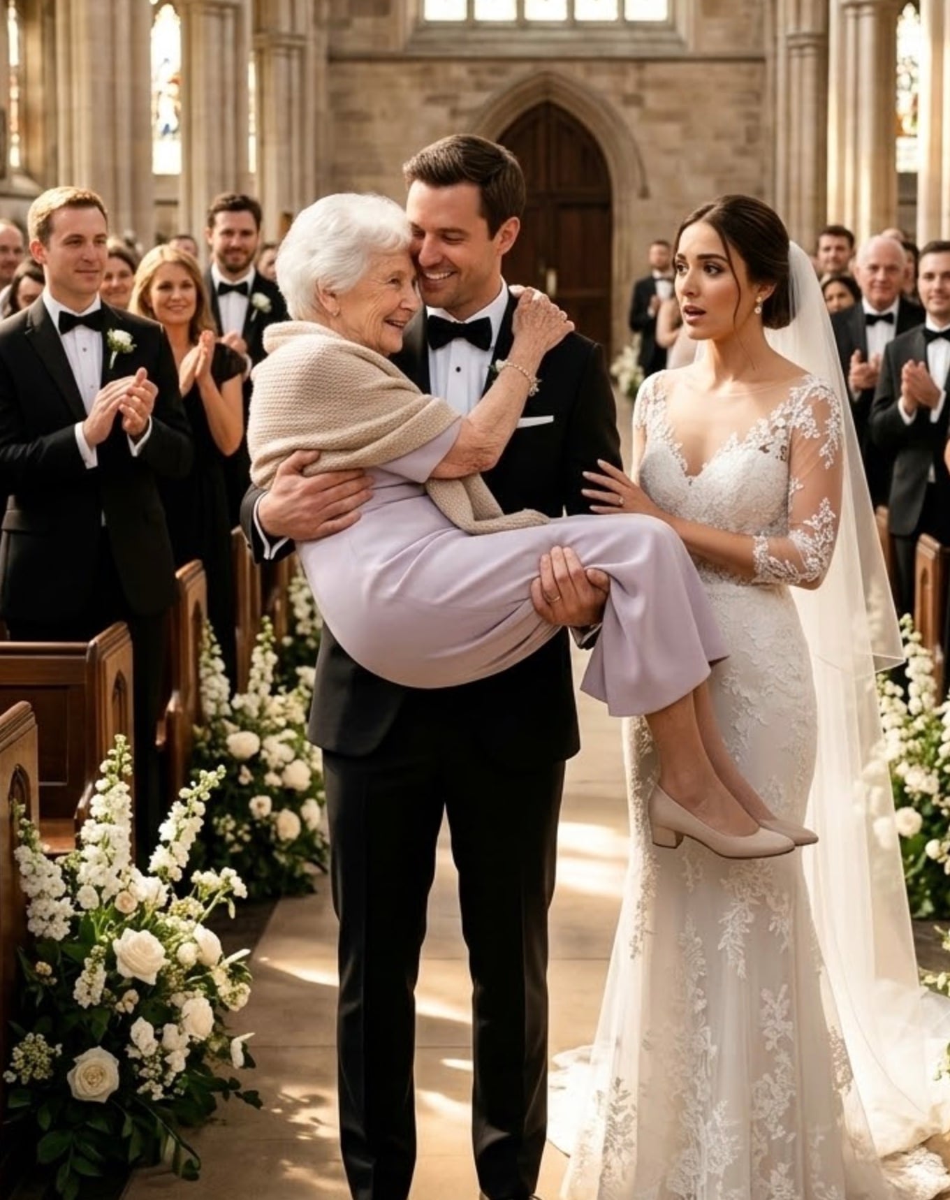 Волна смущённого смеха прокатилась по собору, быстро затихнув, когда гости поняли, что это не шутка. Луис пронёс миссис Элену несколько шагов по проходу, пока она улыбалась—гордая, победоносная. В зале раздался тревожный шёпот.